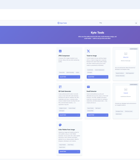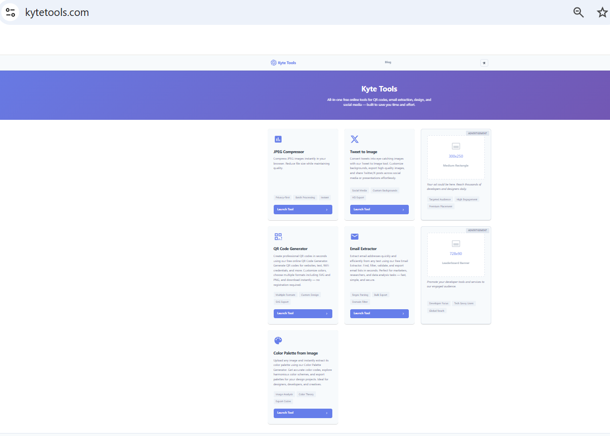 Kytetools – Free Online Tools for Marketing, Design & Productivity Kytetools provides free online tools including QR code generator, email extractor, color palette from images, and tweet to image tools Get Directions Call Now Website Save Share Share facebook twitter linkedin google pinterest Description Maps Photos Description Kytetools provides free online tools including QR code generator, email extractor, color palette from images, and tweet to image tools Maps Map Street View Get Directions Gallery Close Business Info Get Directions Dufferin County, Central Ontario, Ontario, Canada +218911486481 +218911*** show support@kytetools.com kytetools.com Statistic 3 Views يناير 1, 2026